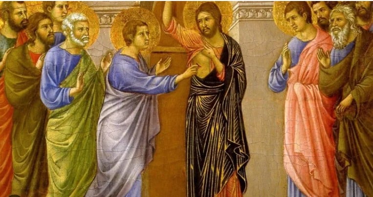Апостол Тома, за да достигне до изповядването на божеството на Господа, преминава най-напред през съмнението. Той не може да повярва, ако няма в ръцете си доказателства. Не може да повярва и да изповяда божеството на Господа и Неговото Възкресение, ако не Го види лично и не положи пръста си върху следите от гвоздеите — за да се увери, че именно разпнатият Господ е Този, Който е възкръснал, че Той е неговият Господ и неговият Бог.